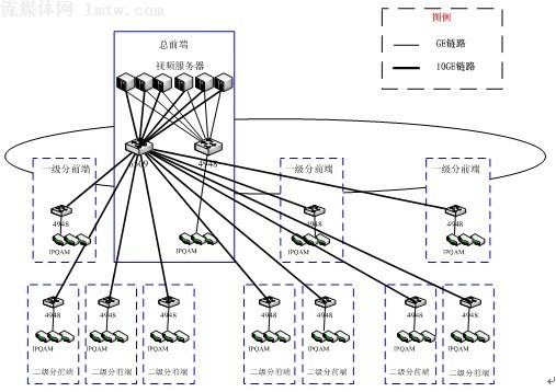 方案二:全集中式。在總前端集中部署若干臺(tái)視頻服務(wù)器,通過(guò)萬(wàn)兆網(wǎng)絡(luò)直接向各分前端提供視頻流服務(wù);示意圖如下: