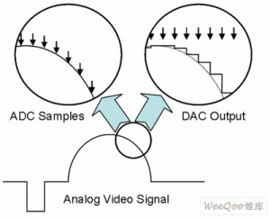 由攝像機或其他設備捕獲的模擬視頻信號通過模/數(shù)轉換器(ADC)進行數(shù)字化處理,它在每個時鐘邊沿即時記錄數(shù)據(jù)(圖2)。模擬信號連續(xù)變化,而轉換成數(shù)字信號時則是定時采樣。經(jīng)過數(shù)字處理和傳輸后,數(shù)字信號通過數(shù)/模轉換器(DAC)轉變成模擬信號。DAC的輸出如圖2的右上角所示,箭頭代表時鐘信號。