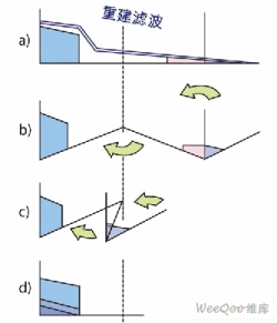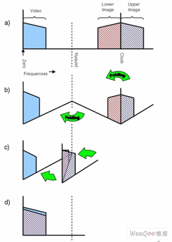 從圖5可以看出重建濾波器的作用,利用參考書中提供的定理可以很容易理解頻譜混疊。通常,在頻域,頻率和放大倍數(shù)都采用對數(shù)刻度,重建濾波器的頻響特性表現(xiàn)為平滑曲線。然而,為了說明邊帶重疊的位置,我們用線性坐標表示頻率和放大倍數(shù)。為了表示低通濾波器在同樣刻度坐標下的衰減特性,從濾波器頻響曲線可以看出:對于有用的視頻信號衰減很少,對于鏡像頻率衰減較大。圖5b和5c顯示了混疊效應,但是應該注意到,與圖3d相比,圖5d中的鏡像頻率被顯著衰減。