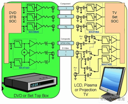 圖6左側是機頂盒或DVD機的框圖,片上系統(tǒng)(SOC)包含了DAC,輸出經(jīng)過低通濾波器(例如MAX7443)進行視頻重建。濾波器芯片還包含75Ω同軸電纜驅動器,驅動信號在電纜上的傳輸。圖6右側用于信號接收,信號在經(jīng)過抗混疊濾波器后送入電視機SOC的ADC。