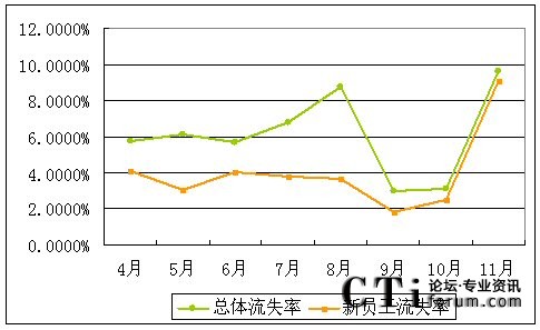 從該中心的運(yùn)營數(shù)據(jù)來看,另一個發(fā)生明顯變化的就是實(shí)行團(tuán)隊(duì)激勵后新員工的流失率開始明顯增加。以下是我們提取4-11月該呼叫中心員工流失方面的數(shù)據(jù):