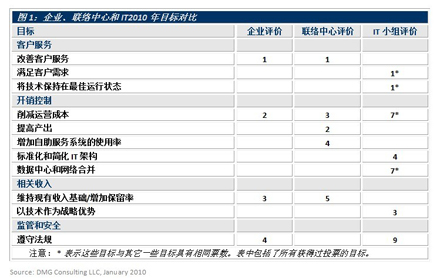 DMG的基準(zhǔn)調(diào)研顯示IT有自己的優(yōu)先級(jí):IT2010年的首要目標(biāo)是滿(mǎn)足商業(yè)客戶(hù)的需求并使企業(yè)的技術(shù)和應(yīng)用軟件運(yùn)行在最佳狀態(tài)。這表明IT企業(yè)是帶著強(qiáng)烈的支持企業(yè)客戶(hù)目標(biāo)和目的的意愿步入2010年的。但令人失望的是IT企業(yè)并沒(méi)有努力去了解他們客戶(hù)的目標(biāo)。這種目標(biāo)上的不一致是導(dǎo)致IT和聯(lián)絡(luò)中心之間缺乏信任的主要原因。