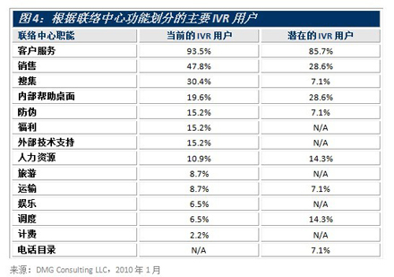 圖4顯示使用IVR的聯(lián)絡(luò)中心類(lèi)型分布非常廣泛。這些聯(lián)絡(luò)中心主要支持外部客戶(hù),如客戶(hù)服務(wù)、銷(xiāo)售、識(shí)別真假和搜集信息,但同時(shí)它也被用來(lái)幫助內(nèi)部客戶(hù),如人力資源、內(nèi)部幫助桌面。DMG希望在未來(lái)幾年里看到更多語(yǔ)音自助服務(wù)軟件的內(nèi)部應(yīng)用,尤其考慮到現(xiàn)在企業(yè)能從托管服務(wù)提供商那里獲得高度可裁減的IVR解決方案,他們只需為自己所使用到的那部分付費(fèi)就可以了。