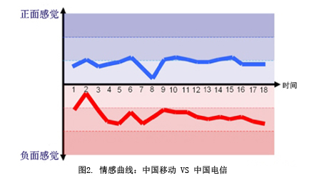 圖2的情感曲線分別是中國移動(dòng)的“喜愛”情感曲線和中國電信的“討厭”情感曲線,對(duì)應(yīng)于雙方整個(gè)呼入電話體驗(yàn)18個(gè)子流程上的情感感受。(注意,我們只列出了中國移動(dòng)的“喜愛”曲線和中國電信的“討厭”曲線來舉例說明。)