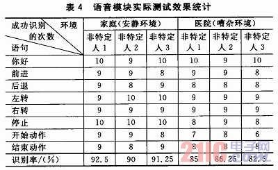 為了保證設(shè)計的語音識別模塊的語音識別率、穩(wěn)定性和響應(yīng)時間,本文對所描述的語音識別模塊做了相應(yīng)的測試,測試環(huán)境分別為安靜的家庭環(huán)境和嘈雜的醫(yī)院環(huán)境,共8條語音指令,對每條語音指令分別進行10次測試,每個環(huán)境下對每個特定人的總實驗次數(shù)為80次,記錄成功識別的次數(shù)。測試結(jié)果如表4所列。