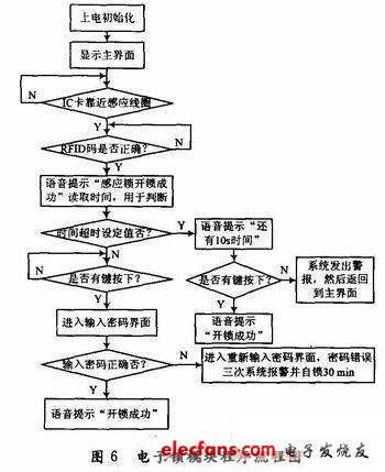 如圖2所示,電子鎖原始密碼和用戶設定密碼已存于外部存儲器E2PROM內,用戶要開門需先用電子感應鑰匙開RFID碼感應鎖,當感應鎖成功開鎖時,系統(tǒng)將發(fā)出語音提示“感應鎖開鎖成功”,然后輸入先前設定的密碼,密碼正確后,系統(tǒng)發(fā)出語音提示“開鎖成功”,否則提示“輸入密碼錯誤”。輸入密碼三次以上錯誤,系統(tǒng)將報警并自鎖30 min。整個開鎖時間不能超過30 s,否則系統(tǒng)發(fā)出警報聲,以防止盜賊在短時間內利用萬能工具開鎖。系統(tǒng)待機時能在液晶上顯示時間、日期和星期等信息,實現(xiàn)友好的人機界面。