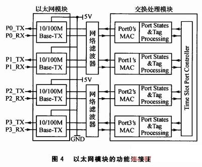 以太網(wǎng)模塊的功能連接圖如圖4所示,進(jìn)出以太網(wǎng)接口的信號(hào)都需要經(jīng)過網(wǎng)絡(luò)濾波器,網(wǎng)絡(luò)濾波器實(shí)質(zhì)上是一個(gè)選頻電路,它的功能就是允許某一部分頻率的信號(hào)順利的通過,而另外一部分頻率的信號(hào)則受到較大的抑制。與網(wǎng)絡(luò)濾波器相連的是交換處理模塊中的Port's MAC(M-edia Access Controllers),用來解決在共用信道中產(chǎn)生競(jìng)爭(zhēng)時(shí)分配信道的使用權(quán)問題。