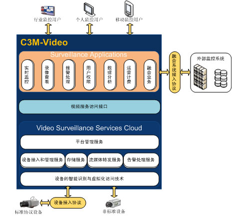 高新興通信最新推出基于云計算的C3M-Video視頻監(jiān)控管理平臺,具有視頻監(jiān)控管理平臺的通用功能和業(yè)務(wù)流程,能支持國內(nèi)外主流的視頻設(shè)備。此外,能與高新興現(xiàn)有的動力環(huán)境監(jiān)控系統(tǒng)進行深度的融合,并以此為基礎(chǔ)逐步演繹成一個支撐物聯(lián)網(wǎng)應(yīng)用的融合監(jiān)控平臺。