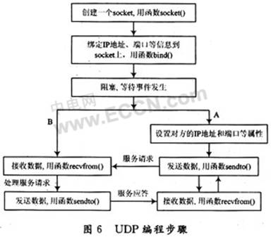 在本系統(tǒng)中,在一個網(wǎng)段內(nèi)的任意兩個應(yīng)用程序之間可以進行全雙工通信,每個應(yīng)用程序既可做為服務(wù)器又可做為客戶端。其UDP編程步驟如圖6所示,以下是兩個應(yīng)用程序A和B之間進行點對點通訊的具體實現(xiàn)過程:
