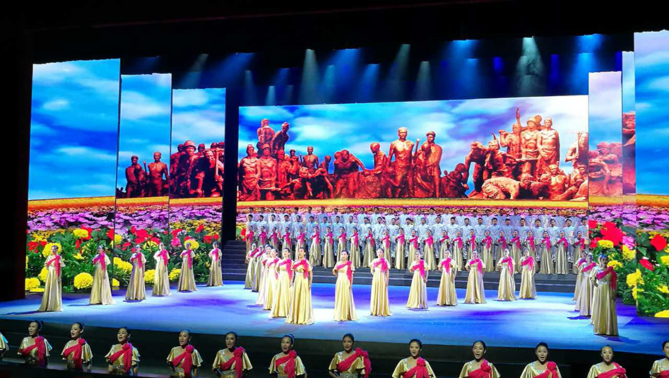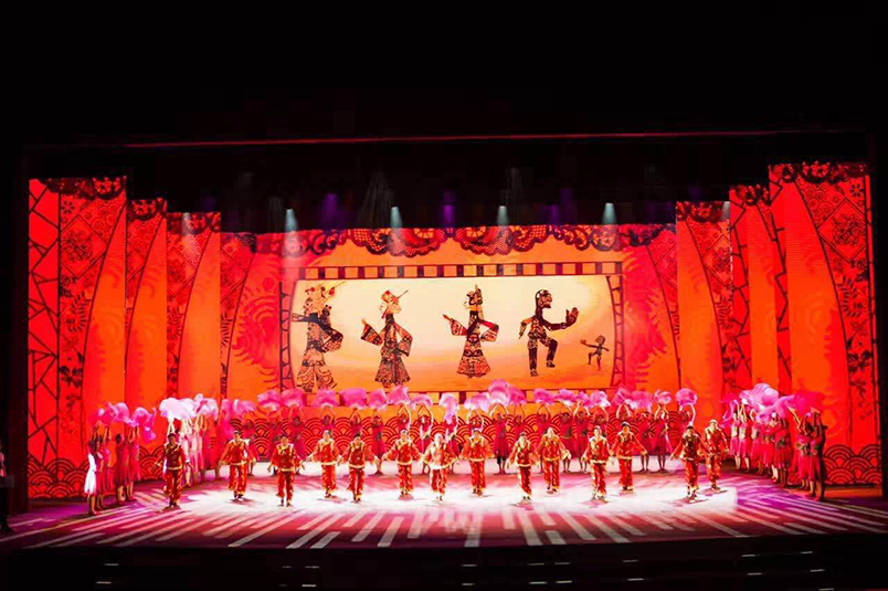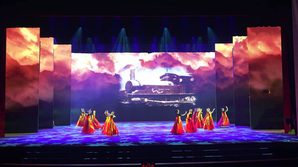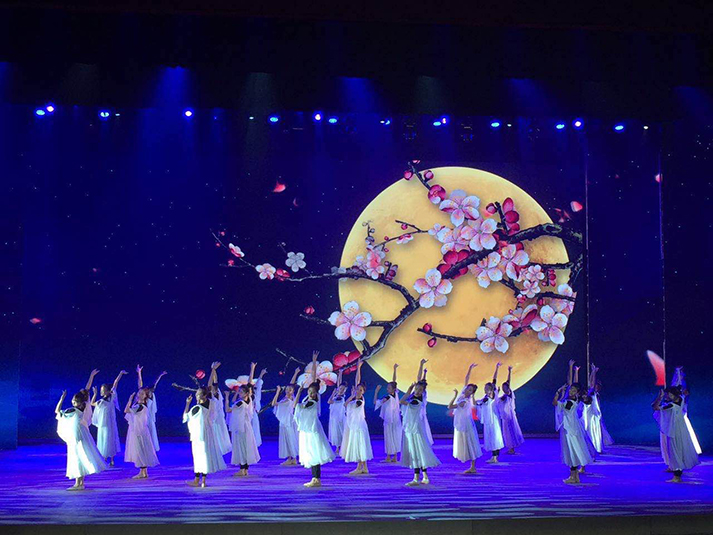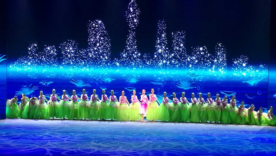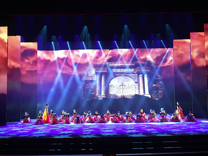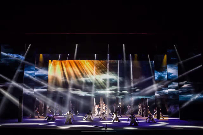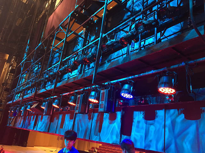 "我從舞臺(tái)劇的燈光設(shè)計(jì)思路出發(fā),用沿幕把所有燈具在舞臺(tái)上隱藏起來,使觀眾看不見燈具只看見色彩和光線。這次晚會(huì)共采用了80臺(tái)1500w圖案燈(特寶麗V2500S)、60臺(tái)1500w染色燈、120臺(tái)光束燈(特寶麗PT320B)、160臺(tái)LED燈、40臺(tái)切割燈(特寶麗V3000P)以及4臺(tái)追光燈(特寶麗FS300M)。切割燈特寶麗V3000P主要做面光使用,用于把舞臺(tái)多余的光切掉,使舞臺(tái)更干凈更透亮,同時(shí)也讓演員和舞美道具等清晰可見?!靶′撆凇焙蒲蠊馐鵁鬚T320B主要用于打造炫目的舞臺(tái)效果;我在設(shè)計(jì)中將圖案燈里面的圖案與染色燈的色彩功能充分疊加之后鋪照在舞臺(tái)上,這種方式能夠呈現(xiàn)出更加繽紛和絢麗的圖案效果;地流燈和側(cè)光的運(yùn)用則讓每一位演員都在舞臺(tái)上呈現(xiàn)更加立體。