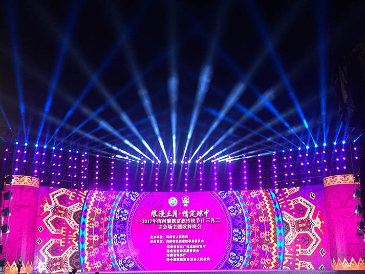 今晚(農(nóng)歷三月初三),由海南省人民政府主辦,海南省民族宗教事務委員會、海南省文化廣電出版體育廳、海南省旅游發(fā)展委員會、海南省商務廳、瓊中黎族苗族自治縣人民政府承辦,以“浪漫三月·情定瓊中”為主題的2017年海南黎族苗族傳統(tǒng)節(jié)日三月三主會場活動在瓊中三月三廣場隆重開幕。浩洋電子自主研發(fā)特寶麗品牌近500臺高品質(zhì)專業(yè)舞臺燈光產(chǎn)品:全能王三合一G9 HYBRID、切割燈V3000P、光束燈G9B、染色燈V1500TW、大光束燈V1500TB、防水固定染色燈OVAL 60D等炫耀擔任瓊中主會場舞臺燈光主力,為今年海南“三月三”民俗節(jié)慶晚會傾力獻力。