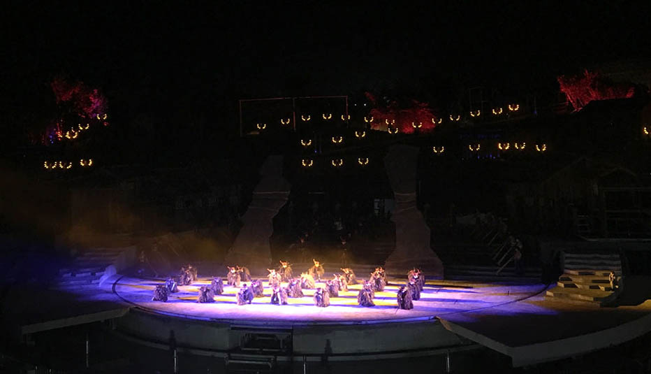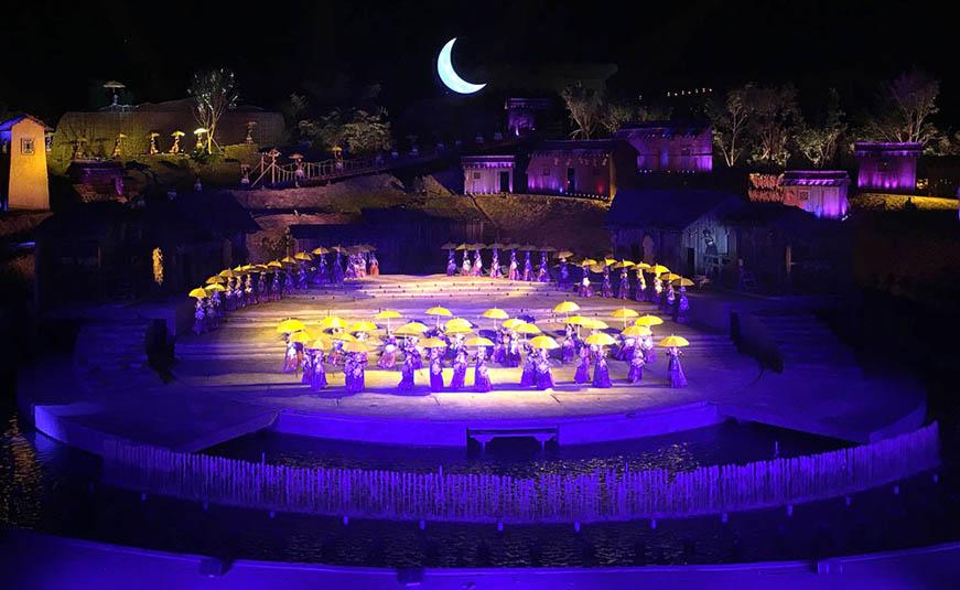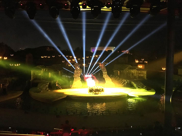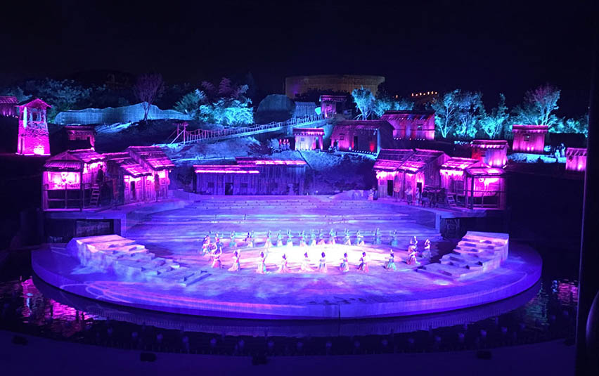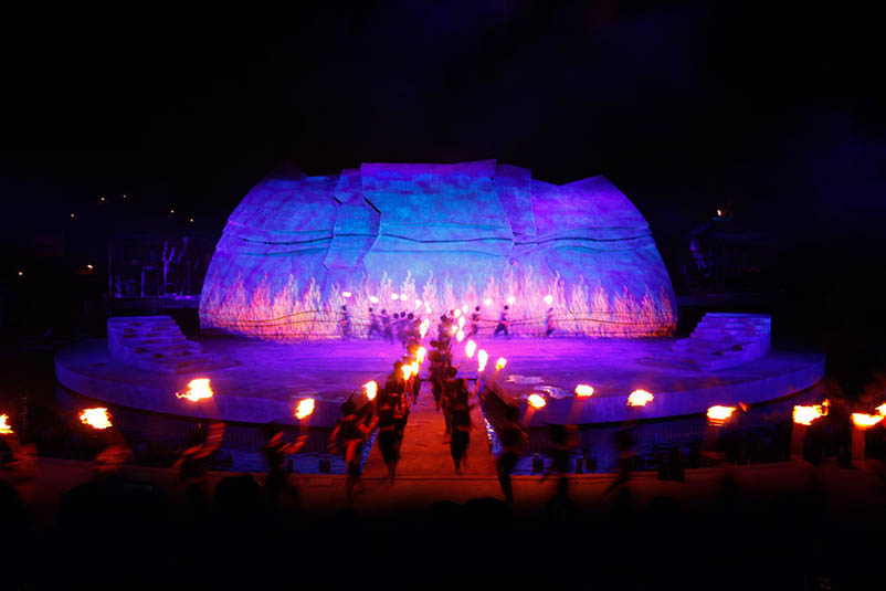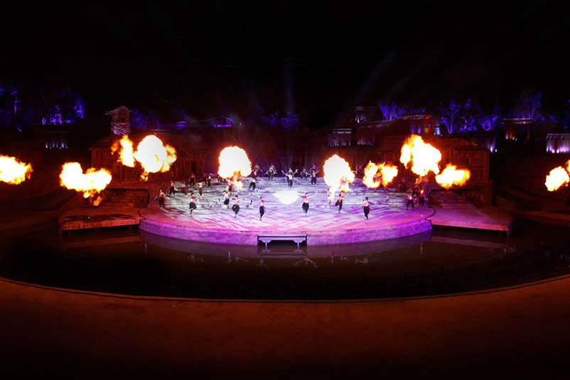 《阿惹妞》作為一部風(fēng)情實(shí)景劇,演出舞臺(tái)全部為戶外實(shí)景,既有遠(yuǎn)山又有流水,場(chǎng)景宏大,因此對(duì)舞臺(tái)景物布光要求很高,不僅要使景物光線分布均勻且達(dá)到足夠的亮度,對(duì)燈光的層次性要求也非常高,既要保證遠(yuǎn)方山峰的輪廓清晰可見,又要讓觀眾看得清舞臺(tái)中區(qū)演員的表演。G12 HYBRID 能夠做到大范圍均勻鋪光,且具有超高光通量,發(fā)光效率高的同時(shí)具備遠(yuǎn)距離照射的能力,在保證遠(yuǎn)景和中景清晰的前提下,運(yùn)用G12 HYBRID亮度變化,配合現(xiàn)場(chǎng)光焰等特效,能夠制造出極具擴(kuò)張感的震撼視覺效果。