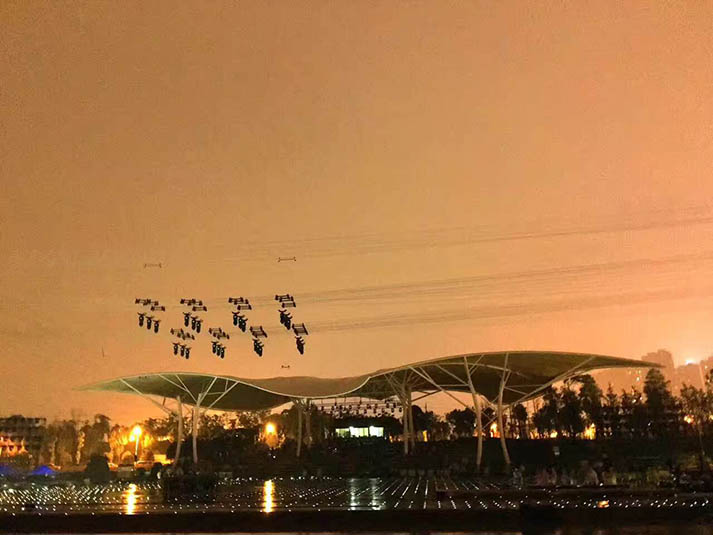 總導(dǎo)演李彥介紹,全劇不僅通過(guò)音、舞、詩(shī)、樂、頌等多種藝術(shù)載體,還原了瀏陽(yáng)河最美的人、景、民俗和史實(shí),更有多處創(chuàng)新:視覺方面,首次將瀏陽(yáng)焰火融入實(shí)景演出;燈光特效方面,更是大膽采用了今年央視春晚全球首次使用的“天外飛燈”。繼2017央視春晚桂林分會(huì)場(chǎng)的“天外飛燈”表演秀驚艷全球后,浩洋電子“天外飛燈-FOS360”系統(tǒng)強(qiáng)勢(shì)助陣大型田園花火情境實(shí)景演出《瀏陽(yáng)河上》,再次實(shí)現(xiàn)專業(yè)舞臺(tái)電腦燈飛行演出,打造飛行燈光舞臺(tái)。浩洋電子通過(guò)極富創(chuàng)意的燈光設(shè)計(jì)和表現(xiàn)力十足的燈光應(yīng)用,生動(dòng)演繹了瀏陽(yáng)河的精神風(fēng)貌。