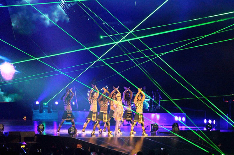 演唱會當晚使用了大量浩洋電子鉑金16R染色燈PT330W,它外形輕巧,光斑角度小,能夠渲染出柔和細膩卓爾不群的舞臺效果,為水果姐KatyPerry打造出炫目舞臺效果!她全場激情獻唱近20首大熱單曲,歌迷從頭合唱到尾,十分熱情。