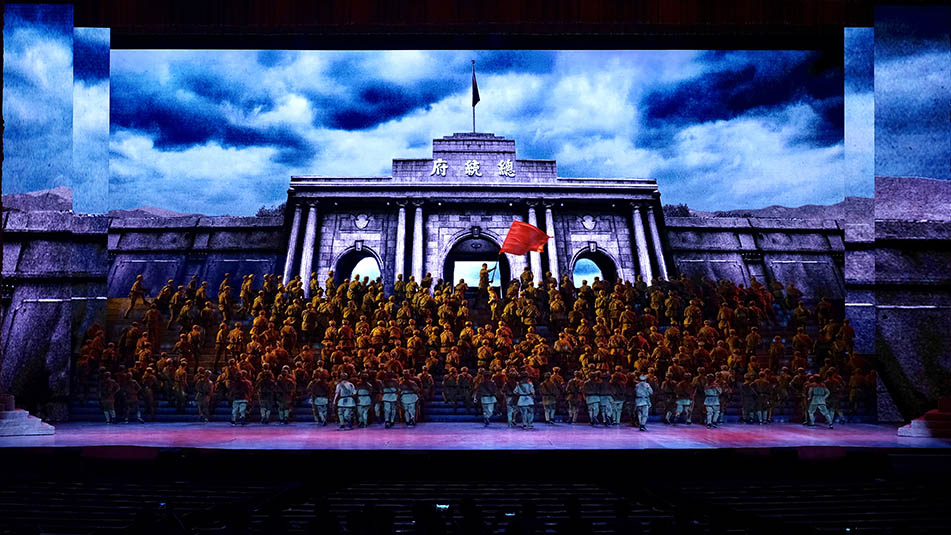 舞臺上舞美布景與燈光、視頻、投影等舞臺視覺形式的有機融合是晚會的亮點與難點。如此豪邁氣概的演出得益于晚會陣容強大的幕后團隊:總導(dǎo)演楊笑陽、舞美總設(shè)計孫天衛(wèi)、燈光總設(shè)計沙曉嵐、音頻總設(shè)計何飚再加上其他行業(yè)精英成員強強聯(lián)合,以舞美、燈光、音響、投影、視頻、舞臺機械等多種舞臺手段,呈現(xiàn)出恢弘壯麗的舞臺效果。