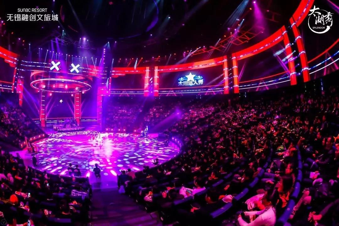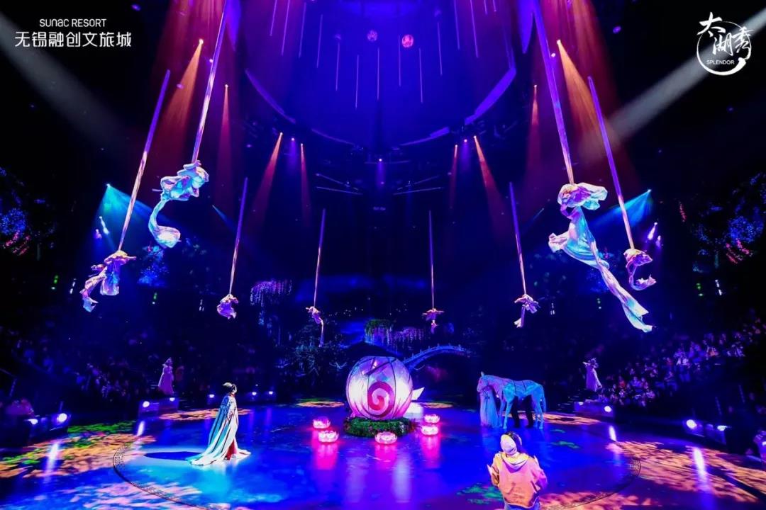太湖秀劇場(chǎng)的創(chuàng)作靈感來(lái)自于江南特色的“竹林”,外圍是365根層疊錯(cuò)落的仿竹鋼立柱,屋頂使用不規(guī)則的三角形金屬百葉板進(jìn)行裝飾。3萬(wàn)平米的劇場(chǎng)內(nèi),直徑16米的主舞臺(tái)可實(shí)現(xiàn)360°旋轉(zhuǎn)、2米升降和10°傾斜,空中1800㎡的360°環(huán)形LED大屏嚴(yán)絲合縫,配合11臺(tái)高速布景吊機(jī)、22個(gè)高速雜技卷?yè)P(yáng)機(jī)、500多個(gè)高空舞美吊點(diǎn)打造沉浸式的視覺(jué)盛宴,此外還有先進(jìn)的高空3D噴泉和舞臺(tái)水處理系統(tǒng),可以實(shí)現(xiàn)干舞臺(tái)和水舞臺(tái)的快速切換。