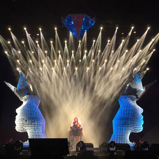 一向?qū)σ魳酚兄鴺O致要求的張惠妹團隊,在「烏托邦世界巡城演唱會」中,更是投重金打造世界級硬件設備及舞臺道具。作為打造演唱會燈光效果的主力武器,浩洋電子轟天炮G10B憑借全球頂級的高亮度輸出特性、銳利的光束和完美的棱鏡效果,為“烏托邦”現(xiàn)場營造了時而狂野,時而歡樂的舞臺氛圍。而浩洋電子另一款小體積、長壽命的染色燈PT330W,也用柔和細膩的CMY均勻渲染效果,令現(xiàn)場似烈果繽紛、如沐幻境。在燈光師的詮釋之下,二者光束與染色交融演繹,使整個巡演舞臺呈現(xiàn)出靈動、華麗的光影視覺,讓歌迷獲得極具沖擊力的感官體驗。數(shù)十場演出下來,由浩洋燈光營造的超震撼視覺效果,無疑成為「張惠妹2015烏托邦世界巡城演唱會」的最大亮點之一。
