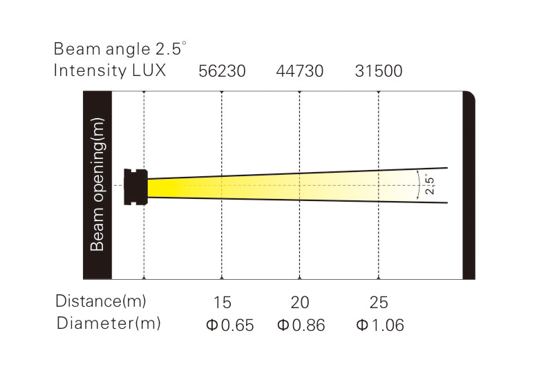 光斑角度:2.5°,獨特的光路結構使光束效果更強更亮