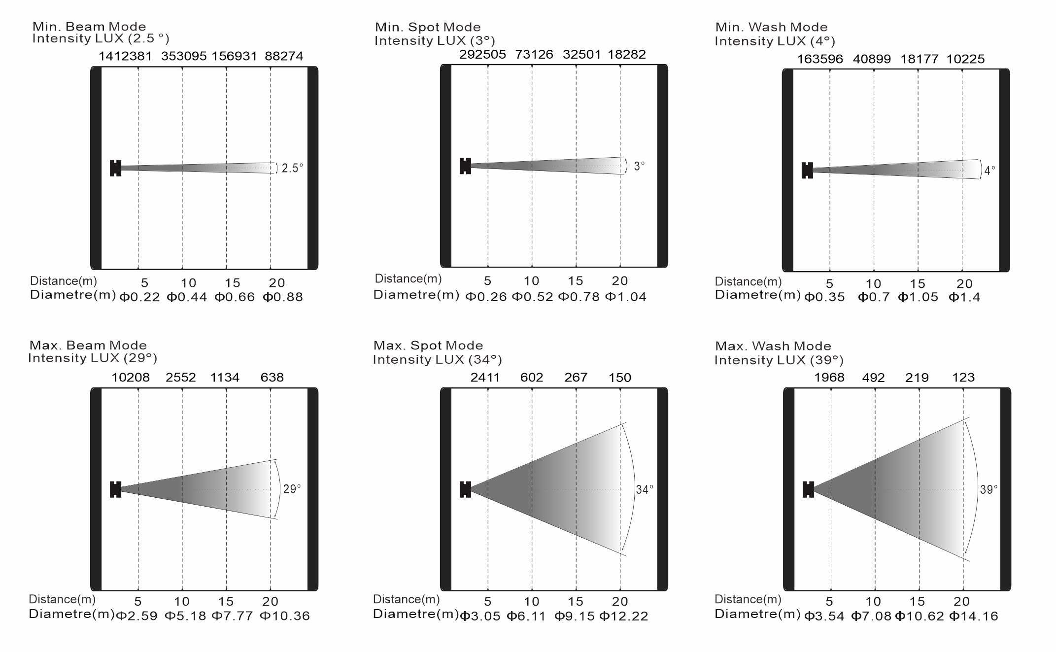 變焦范圍:光束模式:2.5°-29°;圖案模式:3°-34°;染色模式:4°-39°
