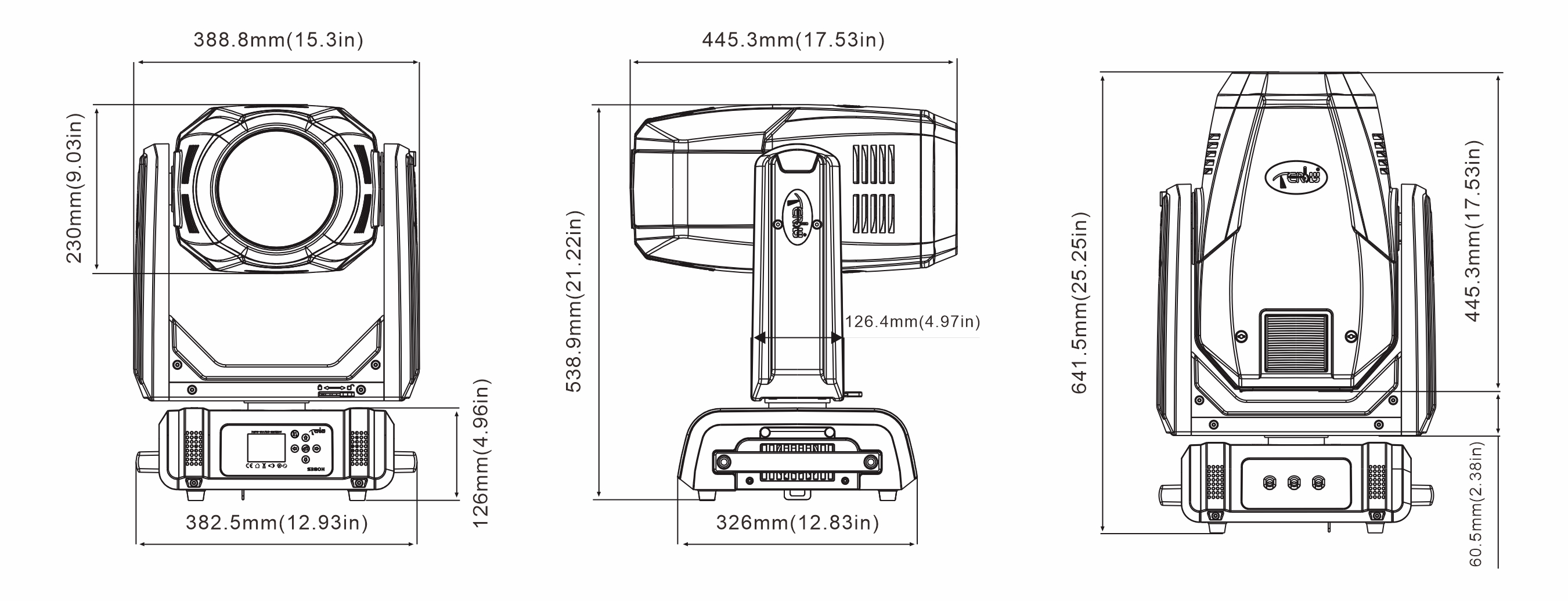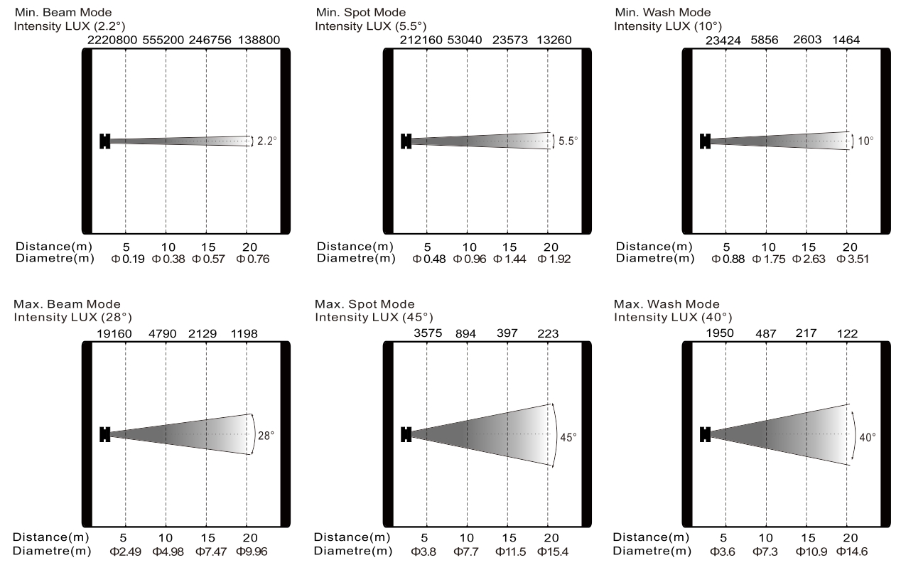 變焦范圍:光束模式:2.2°- 28°;圖案模式:5.5°-45°;染色模式:10°-40°