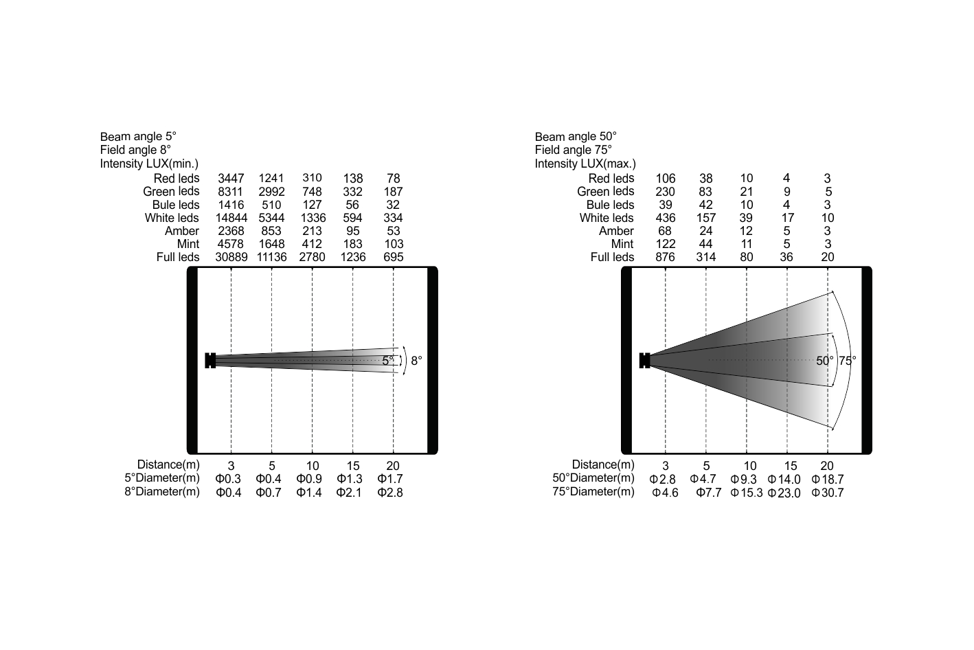 放大:光束角:5°-50°,光斑角:8°-75°