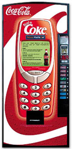 在澳大利亞,澳大利亞電訊和可口可樂公司聯(lián)合發(fā)布了一項(xiàng)新業(yè)務(wù)的試運(yùn)營(yíng):“撥打可口可樂”。這項(xiàng)新業(yè)務(wù)使該公司的后付費(fèi)移動(dòng)電話客戶可以使用他們的GSM移動(dòng)電話,在可口可樂售貨機(jī)上購(gòu)買他們喜愛的飲料。這次試驗(yàn)在悉尼中央車站的17臺(tái)可口可樂售貨機(jī)上進(jìn)行。