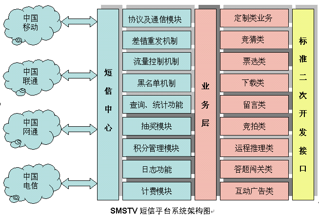 SMSTV短信增值平臺產(chǎn)品由通信層(短信中心)、業(yè)務(wù)層(業(yè)務(wù)平臺)和接口層(標(biāo)準(zhǔn)二次開發(fā)接口)三層組成(參見2.2.2系統(tǒng)架構(gòu)圖),三層之間通過專有網(wǎng)絡(luò)協(xié)議互聯(lián),實現(xiàn)高速數(shù)據(jù)通信。