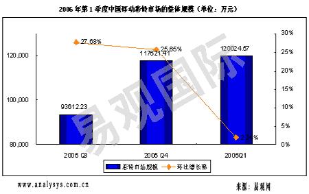 新華美通消息:易觀國際研究表明,2006年第一季度,CRBT 業(yè)務(wù)整體市場規(guī)模達(dá)到16億元,環(huán)比增長率為5%,增長速度較上個(gè)季度大幅度下降,業(yè)務(wù)已經(jīng)進(jìn)入低級飽和期。其中中國移動(dòng)的彩鈴業(yè)務(wù)的市場規(guī)模環(huán)比增長率僅僅為2%,如果扣除中國移動(dòng)和中央電視臺合作進(jìn)行的春晚彩鈴業(yè)務(wù)收入,中國移動(dòng)彩鈴業(yè)務(wù)市場規(guī)模實(shí)際略有下降。