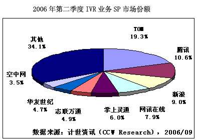 計(jì)世資訊(CCW Research)調(diào)研顯示。2006年第二季度,中國SMS業(yè)務(wù)市場規(guī)模達(dá)到118.3億元人民幣,其中SP收入12.1億元人民幣。TOM、騰訊和新浪排名前三位,分別占12.5%、9.6%和9.1%。其次為掌上靈通和空中網(wǎng),占8.6%和8.3%。