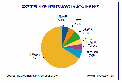 從企業(yè)實(shí)力和市場(chǎng)份額來(lái)看,目前手機(jī)游戲市場(chǎng)主要有三股力量組成,以空中等為代表的全業(yè)務(wù)線電信增值服務(wù)商(SP),以新浪等為代表的互聯(lián)網(wǎng)門戶綜合服務(wù)商,以米格、魔龍為代表的專業(yè)手機(jī)游戲產(chǎn)品與服務(wù)提供商(SP)。根據(jù)中國(guó)移動(dòng)“百寶箱”第1季度收入數(shù)據(jù),易觀注意到,掌中米格、北京新浪、廣州摩訊位列前三,前三名占據(jù)了近20%的市場(chǎng)份額。夢(mèng)網(wǎng)手機(jī)游戲精品業(yè)務(wù)的三家服務(wù)提供商第一季度收入排名為:米格、新浪、空中網(wǎng)!
