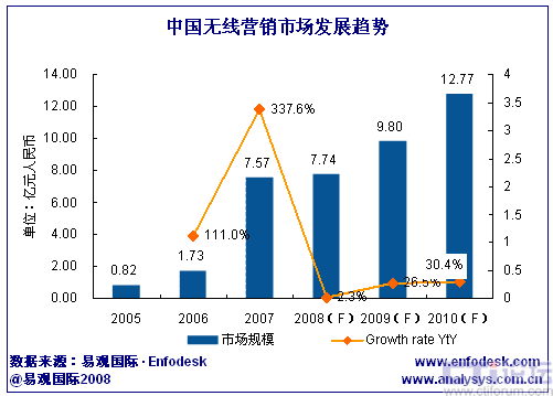 易觀國際(Analysys International)預(yù)計,2010年中國無線營銷整體市場規(guī)模將增至12.77億。其中增長最迅速的細(xì)分市場為WAP類廣告,預(yù)計2010年,WAP廣告在整體市場中所占份額將達(dá)56.7%,2007年至2010年WAP廣告市場收入平均復(fù)合增長率72.1%。WAP市場的增長動力將逐步由業(yè)內(nèi)廠商向傳統(tǒng)行業(yè)廠商擴展。