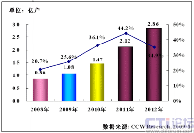 計世資訊(CCW Research)研究預測,2009年中國移動支付用戶數將達到1.08億戶,其同比增長率將達到25.6%,預計2010年中國移動支付用戶數將達到1.47億戶,其同比增長率將達到36.1%,2011年中國移動支付用戶數將達到2.12億戶,其同比增長率將達到44.2%,2012年中國移動支付用戶數將達到2.86億戶,其同比增長率將達到34.9%。
