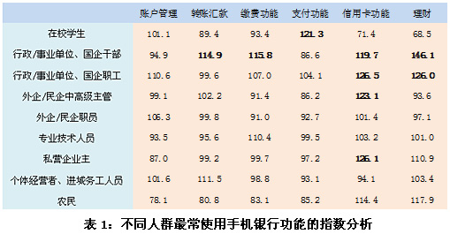 在本次調(diào)研中,對不同人群最常使用手機(jī)銀行功能的指數(shù)分析表明,在校學(xué)生更傾向于經(jīng)常使用手機(jī)銀行支付功能,較少使用手機(jī)理財功能;行政/事業(yè)單位、國企干部更傾向于使用手機(jī)銀行的轉(zhuǎn)賬匯款功能、繳費(fèi)功能、信用卡功能和理財功能,尤其是理財功能;行政/事業(yè)單位、國企職工經(jīng)常使用信用卡功能和理財功能的傾向性也非常明顯;外企/民企中高級主管則更傾向于經(jīng)常使用信用卡功能;私營企業(yè)主經(jīng)常使用手機(jī)銀行信用卡功能的傾向性顯著。