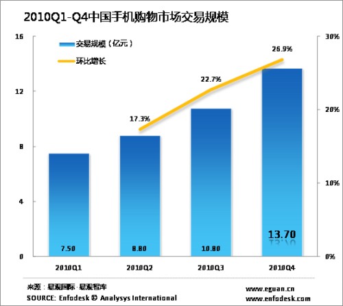2010年中國(guó)手機(jī)購物市場(chǎng)規(guī)模達(dá)41億元