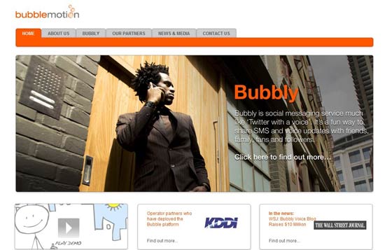 “Bubble Motion”的Bubbly平臺(tái)是一個(gè)手機(jī)端的語(yǔ)音微博服務(wù),允許用戶通過(guò)聲音向他們的關(guān)注者和粉絲發(fā)布狀態(tài)信息,模式與Twitter一樣,只是將文字變成了聲音,微博變成了bubbles,用戶將錄制的聲音更新到手機(jī),然后所有粉絲將收到一條短信通知,點(diǎn)擊短信內(nèi)的鏈接就可以收聽。