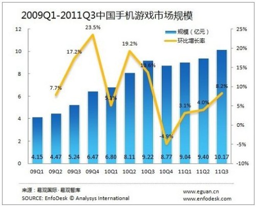 另外,從手機游戲市場規(guī)模來看,2011年第3季度手機游戲市場規(guī)模一舉突破10億大關(guān),達到10.17億,環(huán)比增長8.2%。
