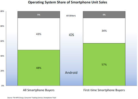Android和iPhone一共占據(jù)了第四季度智能手機(jī)銷售總量的90%。Android在四季度依舊保持了48%的智能手機(jī)市場(chǎng)份額,同時(shí)Android設(shè)備在首次購買智能手機(jī)的消費(fèi)者群中表現(xiàn)更好。根據(jù)NPD每月提供的Smartphone Track服務(wù)的最新數(shù)據(jù),所有在第四季度初次購買智能手機(jī)的消費(fèi)者中,其中57%的消費(fèi)者選擇了Android設(shè)備,而相比較下只有34%的消費(fèi)者選擇了iPhone。