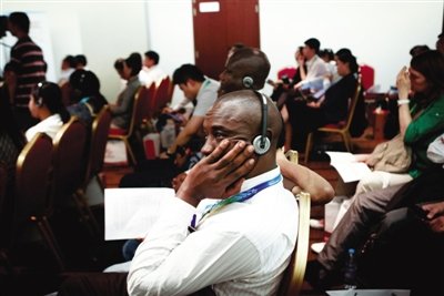 昨日,京交會(huì)上,“中國分銷服務(wù)業(yè)企業(yè)走出去”會(huì)場(chǎng),一位外籍嘉賓在認(rèn)真聽同聲傳譯。新京報(bào)記者 孫純霞 攝