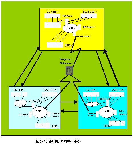 。。"對(duì)于客戶或消費(fèi)者來(lái)說(shuō),其呼叫中心場(chǎng)所的地理分布為多點(diǎn)式。但采取的接入設(shè)備和技術(shù)手段(包括軟件)等,則為一地集中式接入與統(tǒng)一分配來(lái)話。"