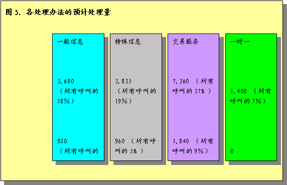 根據(jù)預(yù)計呼叫量的分析,估計人工代表將處理16300個呼叫,IVR將處理余下的3700個呼叫。圖5圖示了各呼叫處理辦法預(yù)計處理的呼叫量。