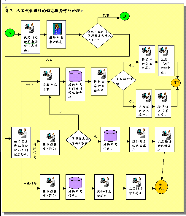在上文提到的各種呼叫處理辦法都需要與提供服務(wù)的公司部門緊密配合和協(xié)作。這些部門將負(fù)責(zé)及時準(zhǔn)確地為呼叫中心服務(wù)提供信息,滿足經(jīng)過呼叫中心或網(wǎng)絡(luò)初期處理的服務(wù)請求。