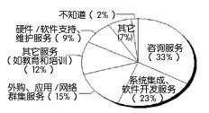 根據(jù)IT支出就可以推測(cè)購(gòu)買(mǎi)過(guò)程及其重點(diǎn)。平均而言,在被調(diào)查者的CRM支出中,29%用在硬件上,16%用在軟件上,38%用在內(nèi)部服務(wù)上,16%用在外部服務(wù)上。圖2顯示了用在外部服務(wù)上的IT支出,其中包括: