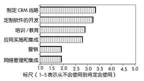 通常,通信提供商相對(duì)而言不愿意求助于專(zhuān)業(yè)服務(wù)公司來(lái)幫助其實(shí)施CRM解決方案。在1~5的標(biāo)尺中,只有積分為5的公司可能使用專(zhuān)業(yè)服務(wù)公司,分?jǐn)?shù)低于3.5的公司沒(méi)有一家會(huì)這么做,這表明通信提供商仍由內(nèi)部人員來(lái)實(shí)施多數(shù)功能。調(diào)查的分?jǐn)?shù)表明他們最可能與外部服務(wù)提供商合作制定戰(zhàn)略——定制軟件開(kāi)發(fā)(3.33)和培訓(xùn)(3.22)。他們最不可能求助此類(lèi)公司來(lái)從事網(wǎng)絡(luò)管理和集成(1.89)或營(yíng)銷(xiāo)(1.89)工作。圖3顯示的就是這些調(diào)查結(jié)果。
