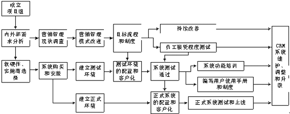 一個(gè)CRM系統(tǒng)的建設(shè)所經(jīng)過的歷程,可以用圖1所示。漢普管理咨詢(中國)有限公司的CRM系統(tǒng)的實(shí)施就是按照這個(gè)路線進(jìn)行的,主要從管理的調(diào)整和信息系統(tǒng)的建設(shè)兩個(gè)方面著手。