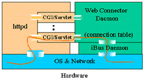 所有來自客戶端的請求(瀏覽器和Applet)都首先發(fā)送給Web Server(HTTP Daemon),然后由httpd啟動相應的CGI/servlet擴展,CGI/servlet模塊僅對上傳的數(shù)據(jù)進行簡單的檢查和打包工作然后就傳給Web Connector Daemon,CGI/servlet模塊本身并不處理連接,它是以一種無連接的方式轉發(fā)一個請求再回送應答。連接的維持和記錄由Web Connector Daemon建立起連接記錄表來完成。