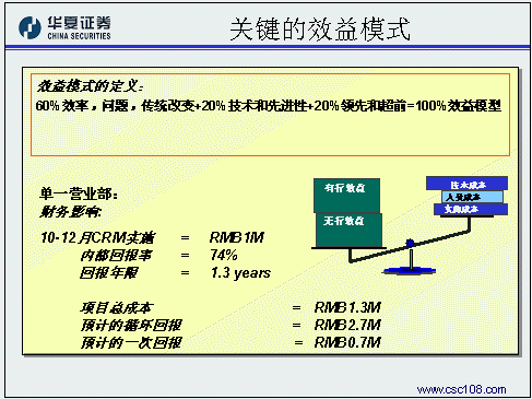 華夏證券經(jīng)紀(jì)業(yè)務(wù)總部的姚磊作為唯一的成功應(yīng)用案例代表,主要是和與會(huì)的金融機(jī)構(gòu)分享在客戶關(guān)系管理規(guī)劃方面的一些成功經(jīng)驗(yàn)。華夏證券認(rèn)為,對于證券公司的經(jīng)紀(jì)業(yè)務(wù)來講,客戶關(guān)系管理的主要目標(biāo)應(yīng)該是把客戶關(guān)系管理系統(tǒng)的核心功能融入開戶、交易、服務(wù)、咨詢等四個(gè)與客戶互動(dòng)的過程之中,比如:客戶資料規(guī)戶整合形成統(tǒng)一的客戶號,管理客戶交易偏好和產(chǎn)品偏好上的變化,配合多種渠道建立一對一銷售流程,客戶終身價(jià)值管理。在風(fēng)險(xiǎn)控制方面,華夏證券同樣貢獻(xiàn)了寶貴的經(jīng)驗(yàn),在這方面他們認(rèn)為最重要的方面是要做好高層領(lǐng)導(dǎo)的灌輸和培訓(xùn)工作,讓企業(yè)的高層領(lǐng)導(dǎo)對于客戶關(guān)系管理有一個(gè)正確的理解,從而對于項(xiàng)目的投資有一個(gè)合理的預(yù)期和實(shí)證,通俗一點(diǎn)說,就是首先為整個(gè)項(xiàng)目找一個(gè)合適的發(fā)起人。第二點(diǎn)要注意,要有專業(yè)的項(xiàng)目管理隊(duì)伍,這其實(shí)就是集成商選擇方面的風(fēng)險(xiǎn)。除此之外,還要對項(xiàng)目要有一個(gè)明確的定義,關(guān)注每一步提交的結(jié)果,在項(xiàng)目過程中就隨時(shí)發(fā)現(xiàn)問題、解決問題。