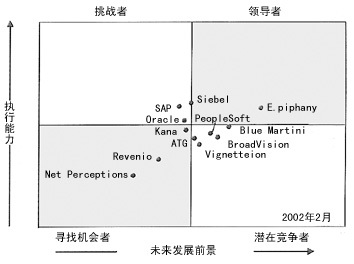 E.piphany依靠其分析能力和個性化方面的優(yōu)勢,仍然是該市場的領(lǐng)導(dǎo)者。但是其領(lǐng)先地位開始受到了強(qiáng)有力的挑戰(zhàn)。其中,Siebel對其領(lǐng)先地位構(gòu)成很大的威脅,正在逐步邁入該市場的領(lǐng)導(dǎo)者行列。Blue Martini Software由于受到其零售和生產(chǎn)能力方面的限制,目前依然稍稍遜色于E.piphany。