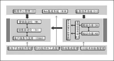 在信息技術管理子系統(tǒng)中,CRM的各功能模塊和相關系統(tǒng)運行都必須由先進的技術、設備、軟件來保障,主要的內容可以分為以下四類:其他子系統(tǒng)應用軟件管理,如數據庫管理系統(tǒng)、電子軟件分發(fā)系統(tǒng)等;中間軟件和系統(tǒng)工具的管理,如中間軟件系統(tǒng)、系統(tǒng)執(zhí)行管理工具等;企業(yè)級系統(tǒng)的集成管理,如CRM與企業(yè)管理信息系統(tǒng)的集成,乃至整個的企業(yè)應用集成方案,以實現(xiàn)將企業(yè)的CRM與ERP、SCM等系統(tǒng)緊密集成;電子商務技術和標準的管理,如Internet技術、EDI技術及標準、通信標準的管理等。為支持無線應用,CRM技術管理子系統(tǒng)將提供與手機、PDA、智能家電等工具的通訊接口,采用J2EE或.NET技術平臺,以及在支持無線傳輸和無線LAN應用等方面進行相應的調整。