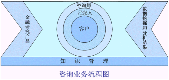 如上圖所示的證券經(jīng)紀(jì)行業(yè)的投資咨詢服務(wù)業(yè)務(wù)流程,是在整體的知識管理的平臺之上,根據(jù)金融產(chǎn)品的信息通道和數(shù)據(jù)分析和挖掘的基礎(chǔ),由咨詢師和經(jīng)紀(jì)人組成可行性的個性化服務(wù)小組為核心客戶提供真正的"一對一"投資設(shè)計和投資咨詢服務(wù)。