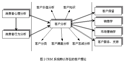 大多數(shù)CRM研究人員和應(yīng)用專家不認(rèn)為CRM存在作為應(yīng)用支撐的理論基礎(chǔ),充其量認(rèn)為CRM只是支持企業(yè)營(yíng)銷的商業(yè)策略。隨著企業(yè)追求市場(chǎng)活動(dòng)績(jī)效的熱情的提高,企業(yè)開始采用定性和定量的分析方法決策其與市場(chǎng)和客戶有關(guān)的企業(yè)活動(dòng),如有效的客戶滿意度評(píng)價(jià)、客戶分類、客戶盈利率分析等。而這些決策迫切需要相關(guān)的理論基礎(chǔ)為指導(dǎo),真正擺脫靠經(jīng)驗(yàn)進(jìn)行決策的做法。當(dāng)前CRM的理論研究和學(xué)術(shù)探討并未真正走向體系化、統(tǒng)一化,所以造成CRM市場(chǎng)中提供的功能參差不齊。CRM系統(tǒng)必須存在一個(gè)完整的理論體系為指導(dǎo),本文將CRM系統(tǒng)賴以存在的理論基礎(chǔ)統(tǒng)稱為客戶理論(Theory on Customer)。